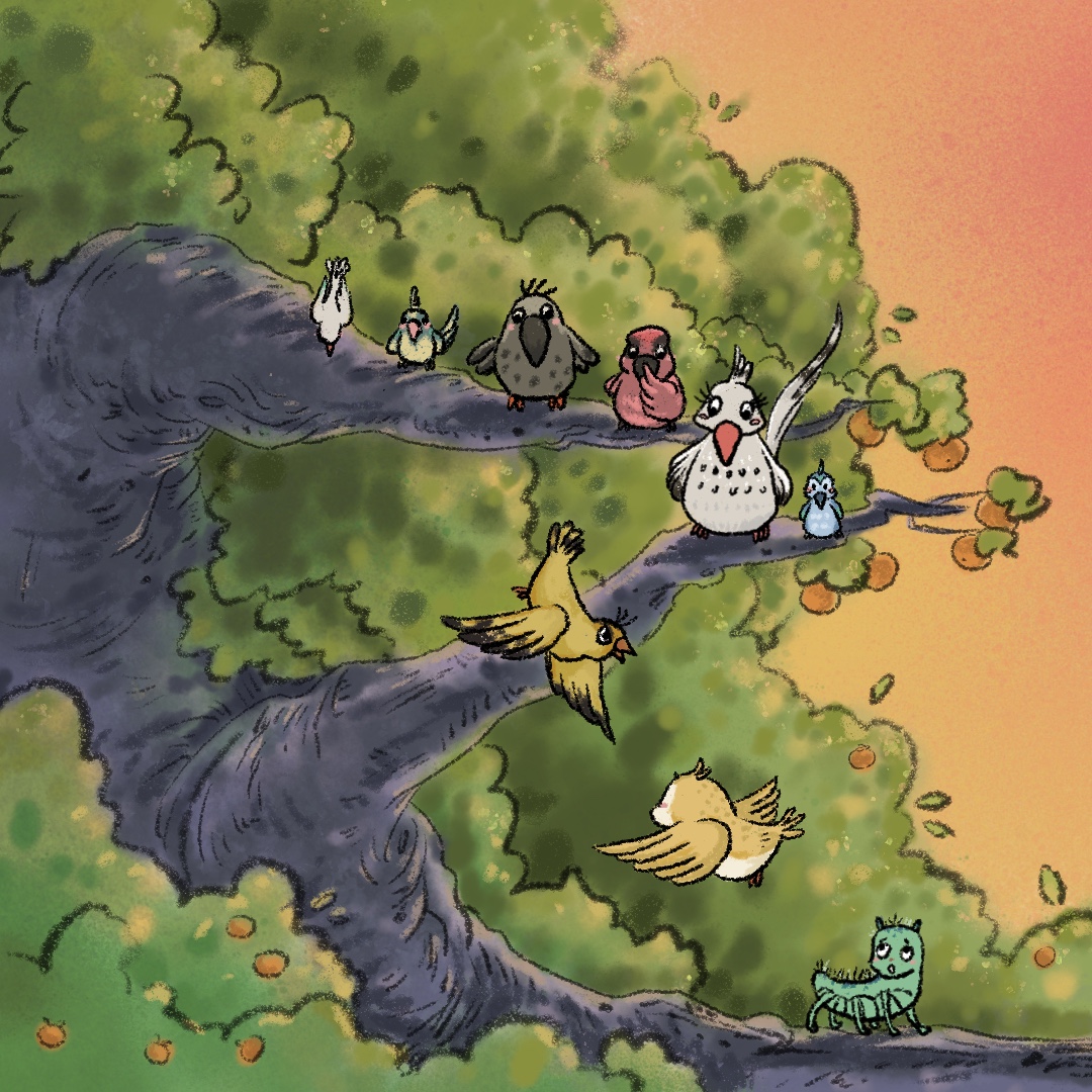 立秋傍晚,柿子树上有很多小伙伴一起乘凉。月亮升起,小黄鹂领唱,大家合唱声嘹亮高昂,同心赞美凉爽的夜晚重新来到。火辣辣和叽叽喳也在这里,它们高兴地加入队伍,努力唱高音。可是,火辣辣一靠近,小伙伴们都躲得远远的。