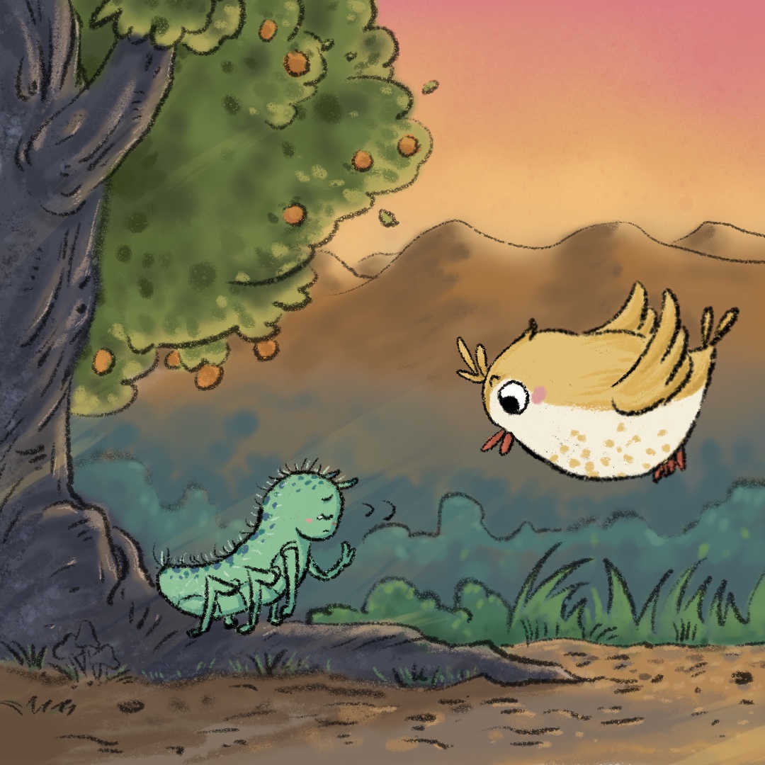 小黄鹂断然拒绝火辣辣,它只邀请叽叽喳:“叽叽喳,不要和火辣辣玩,它是害虫!”叽叽喳大声反驳:“才不是哩,火辣辣是好虫,它是我的朋友!”